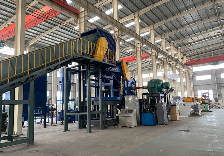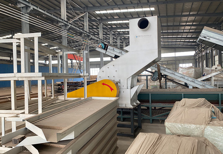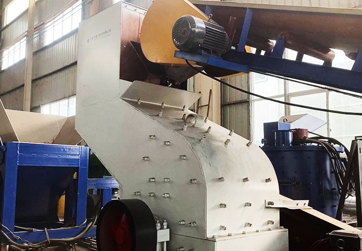 破碎線主機(jī)殼體采用特厚鋼板制造,內(nèi)襯為高錳鑄鋼件,可更換;主機(jī)轉(zhuǎn)子盤安裝于水平軸上,轉(zhuǎn)子盤圓周分布有銷軸,軸向懸有錘頭;主軸用滾珠軸承支撐,循環(huán)油強(qiáng)制潤滑冷卻,并裝有溫度傳感器;進(jìn)料口裝有液壓輥筒喂料裝置,位置一高一低,同向旋轉(zhuǎn),能將大件松散物料壓扁,送入破碎腔內(nèi)。